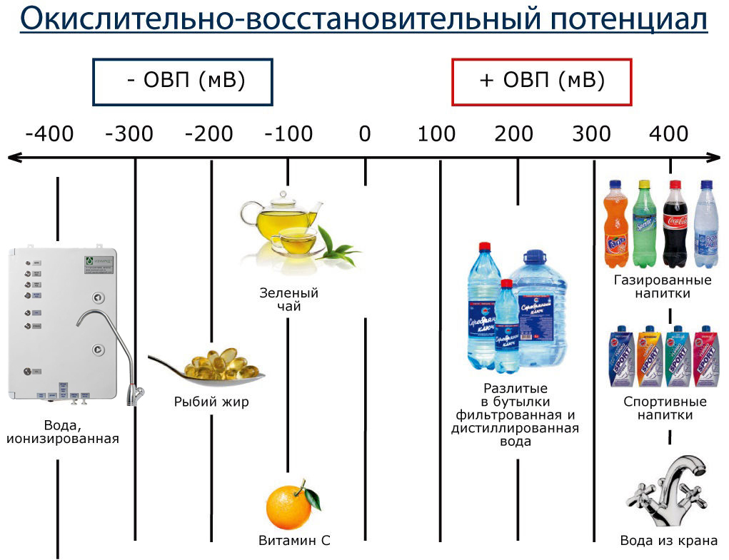 Окислительно-восстановительный потенциал (ОВП) воды — это способность воды вступать в биохимические реакции, определяемая наличием свободных электронов. 1 Параметр выражается в милливольтах (мВ) и измеряется ОВП-метром. Отрицательные значения указывают на восстановительные свойства воды, а положительные — на окислительные.